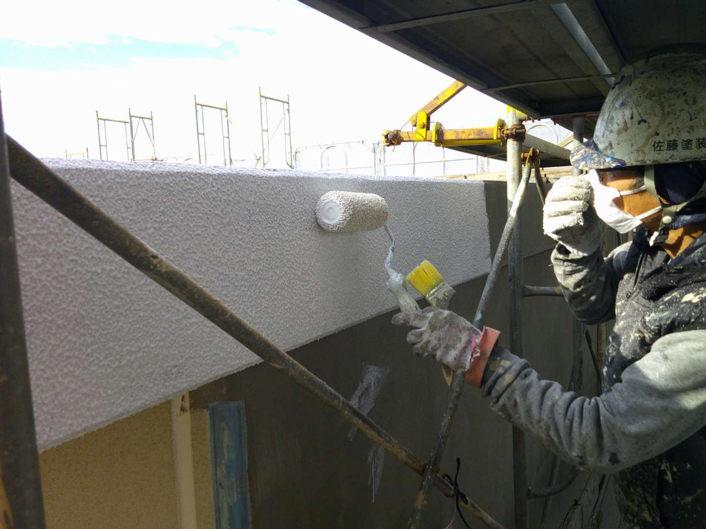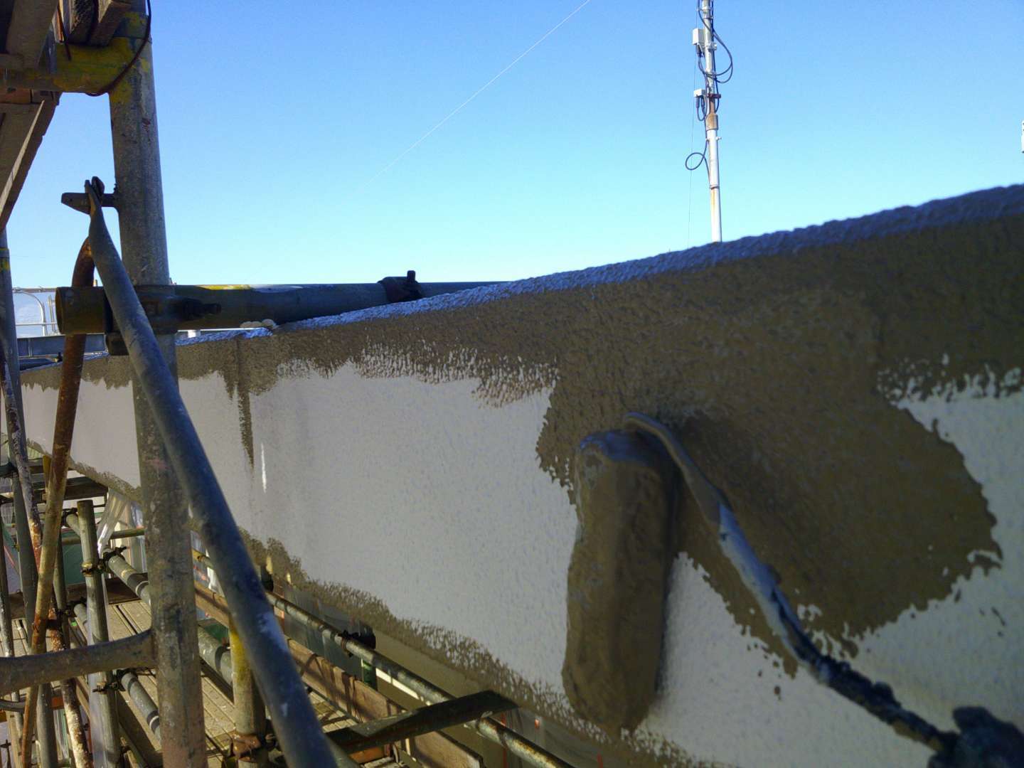 さらに東側の破風(DSCF0274)には、塗装後に「アルミ製笠木」を新設。これにより、雨水がコンクリートの天端に直接触れることを防ぐ「物理的なシールド」が完成しました。フッ素塗装の耐久性とアルミの防水性が組み合わさり、築35年の建物に極めて高い保護機能が付加されました。